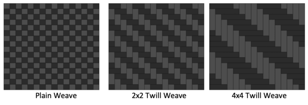 Composite material fabric, or “ply”, is produced in a variety of configurations. The below diagram from CA Composites Ltd. shows the differences between a plain weave, which looks like checkers, and a twill weave, which progresses along an angle. The foundations of each weave are the flat bundles of extremely fine fibers which create the patterns seen below.