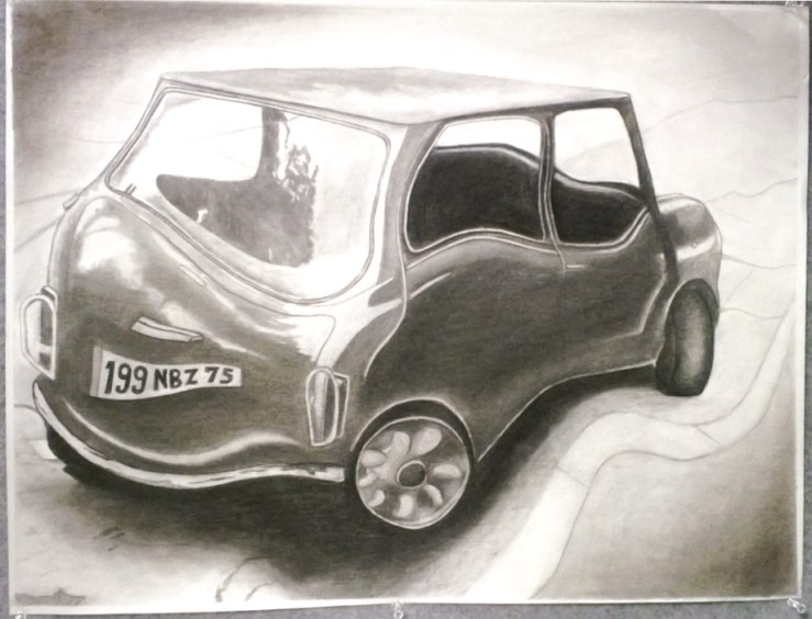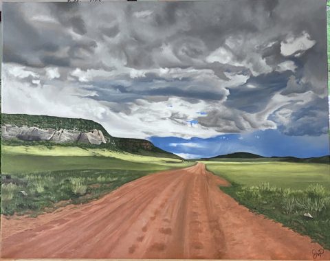 This painting is a gift for my dad’s birthday. It depicts the dirt road which runs through the valley of Park Creek in northern Colorado, a road we frequently ride on our bikes while making a 50 mile loop of the northern front range foothills. Oil on canvas, 16’x20′