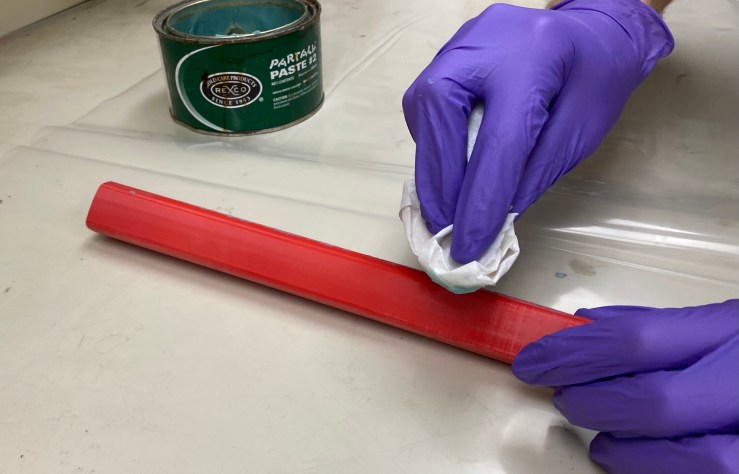 The next step is to prepare the surface of the mold for the lay-up by sanding imperfections then placing the ABS mold in an hour long acetone vapor bath to smooth out the thermoplastics’s surface. See the corresponding image on the right, which demonstrates the application of wax and liquid polyvinyl alcohol (PVA) which acts as a water-soluble mold-release agent.