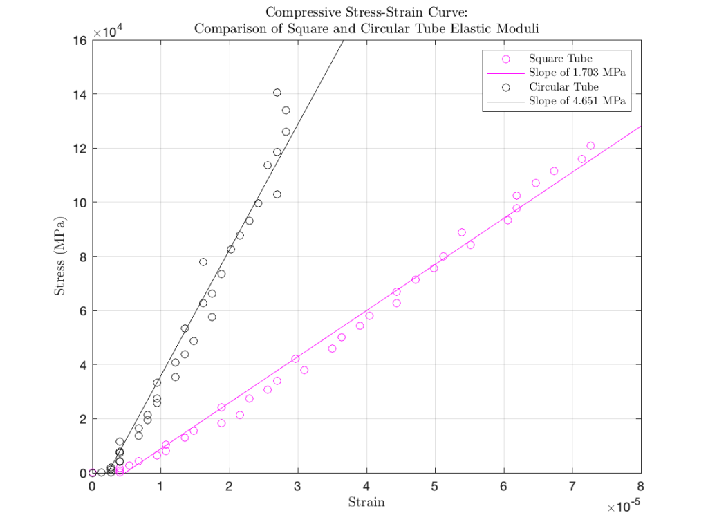 This relation can be applied to both tensile and compressive stresses, and is therefore a useful tool in analyzing the collected load and strain data. To calculate the compressive modulus of elasticity, or young’s modulus, for each tube, it is first necessary to plot the resulting stress-strain curve, shown here. From this plot, it is possible to identify the linear portion of the curve corresponding to elastic deformation in the material. Due to the extremely low loads used in testing, the resulting data will fall solely within this linear pattern.