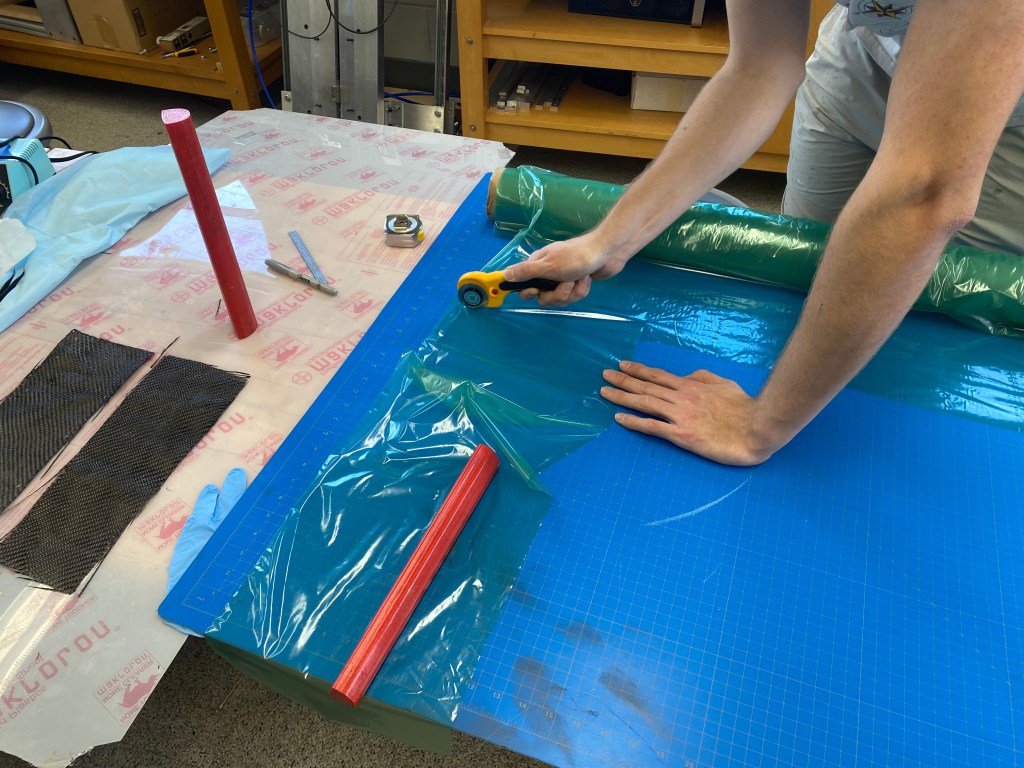 The timing of processes a wet lay-up procedure is crucial, so it is important to keep an eye on the clock, as well as have all materials well organized and all plys (carbon fiber, peel ply, and breather ply) measured and cut before mixing the two-part epoxy. The primary time constraint stems from the limited pot life of the epoxy resin, which is about 25 minutes for the product used in this project. Acting quickly, accurately, and carefully is key.
