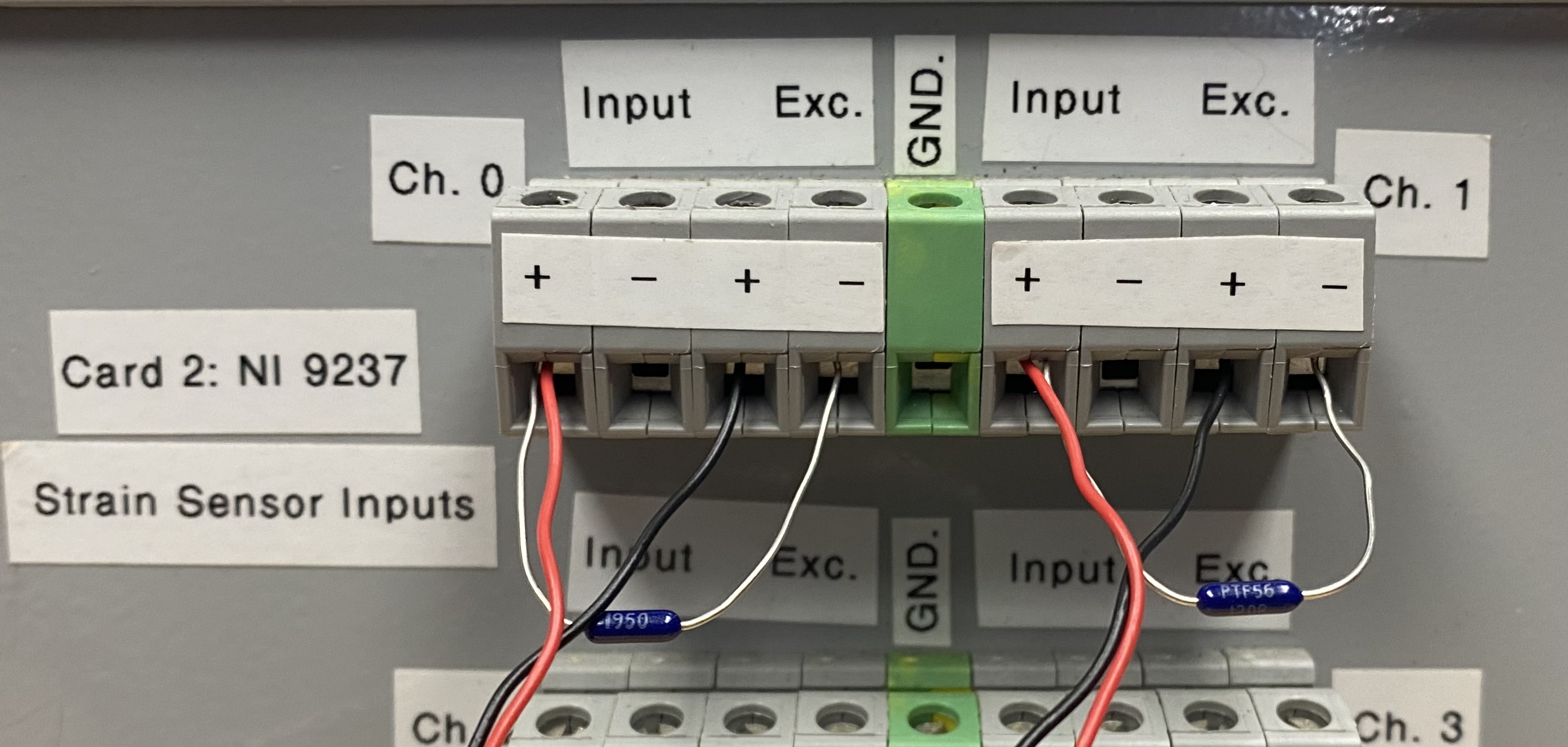 Next, I used the Quarter Bridge II diagram above to develop a physical circuit in conjunction with an NI 9237 bridge completion card. The basics of a Wheatstone bridge circuit can be found here and here. For a T-rosette gauge, there are two strain gauges oriented orthogonally. As each strain gauge in the T-configuration has only one output, and there are two strain gauges per tube, I created two Quarter Bridge circuits. Using the circuit diagram above, R4 is the strain gauge input and R3 is a 120 Ω resistor. The gauge factor listed is 2.08, and I selected a Poisson’s ratio of 0.1 according to Sandia National Lab’s 2018 Report on the Mechanical Properties of Woven Composites at Ambient Temperature.