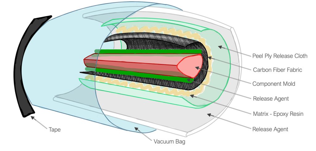 It is important to become familiar with each of the individual materials used in a composite manufacturing procedure, as they are many but each has a specific and important role to play. I created the diagram below to demonstrate how each of these pieces are placed during the curing process, and indicate the order of operations for the manufacturing process.