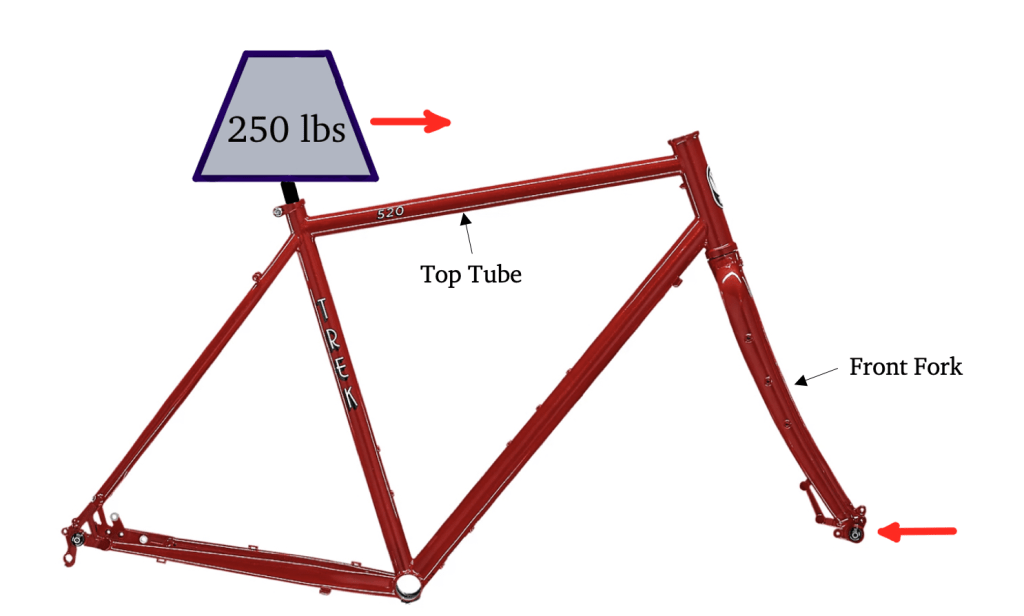 Given that the rider (113 kg) decelerates at a pace of 8.9 m/s in 5 seconds, the resulting force of the rider’s body in the horizontal plane is 201.1 kgm/s^2 or 201.1 N. Given that each joint in the bike is has unique boundary conditions, let’s assume that 65% of this horizontal load is sustained by the top tube, the component of interest. The resulting force is ~130 N of compressive force being delivered through the top tube to the stationary head tube. After applying a factor of safety of 3, the total compressive load comes out just under 400 N.
