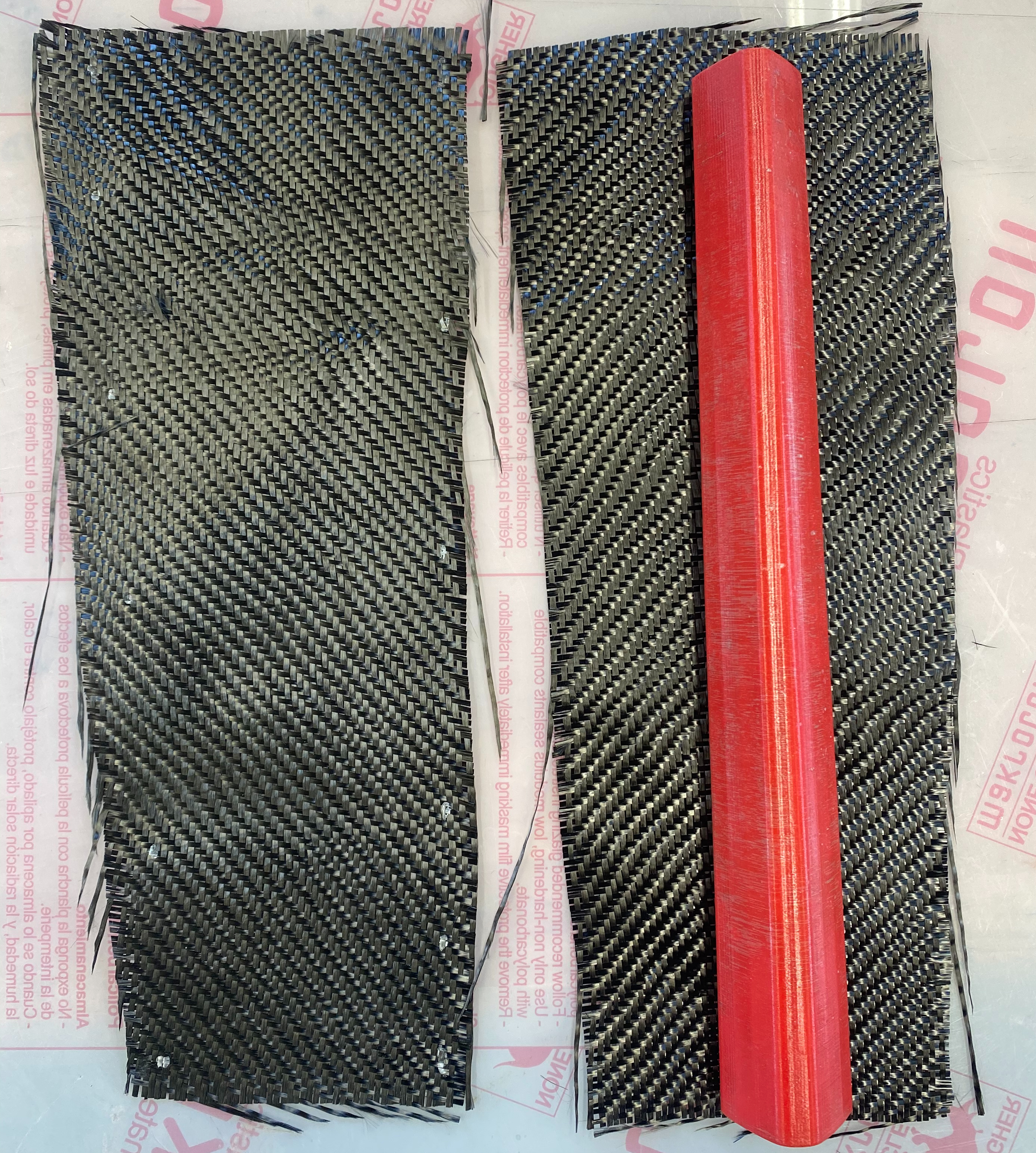 The carbon fiber cloth is the main constituent of a carbon-fiber-reinforced-polymer part, so it is very important to ensure the fabric is cut both accurately and precisely. The weave of the raw fabric can easily become misaligned, and is susceptible to fraying at cut edges. As a result, the fabric should be handled with care and moved as little as possible. Use the sharpie and measuring tool to mark out the shape of the ply, adding about 1″ additional material on each edge. Adding extra material helps to prevent fraying of the fibers in the center of the ply. Carefully cut the material to the specified shape, being sure to not the orientation and angle of the weave relative to the desired position of each ply in the final component. A photo of the cut plys for the 3D printed mold is shown on the right.