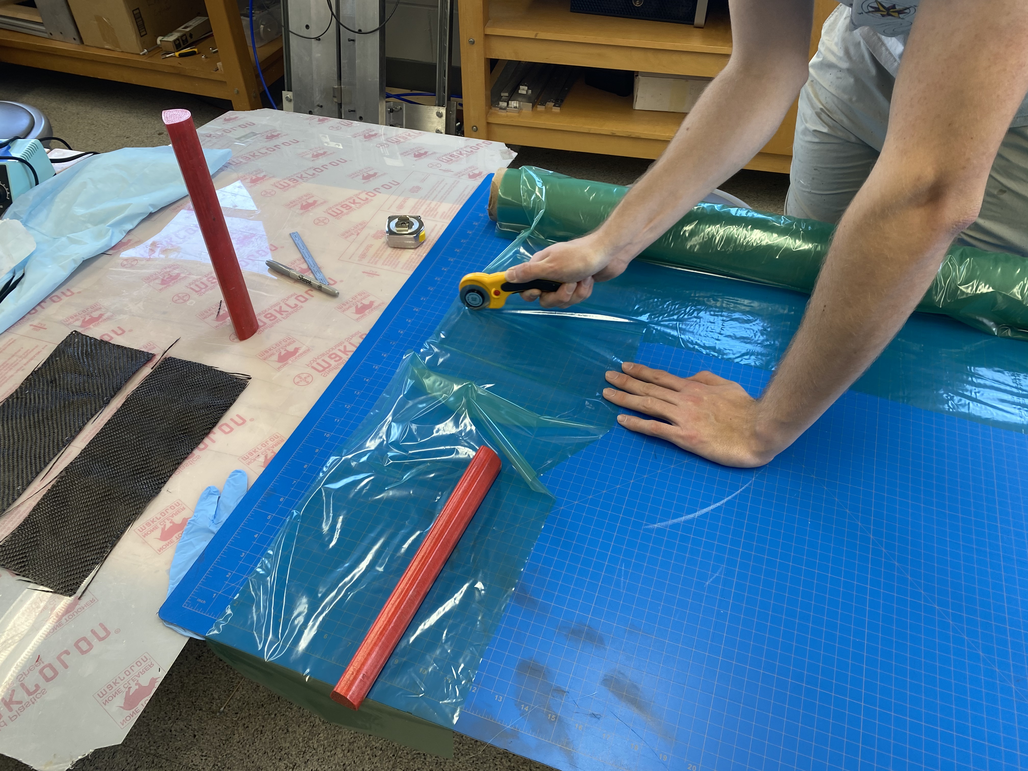 The timing of processes a wet lay-up procedure is crucial, so it is important to keep an eye on the clock, as well as have all materials well organized and all plys (carbon fiber, peel ply, and breather ply) measured and cut before mixing the two-part epoxy. The primary time constraint stems from the limited pot life of the epoxy resin, which is about 25 minutes for the product used in this project. Acting quickly, accurately, and carefully is key.