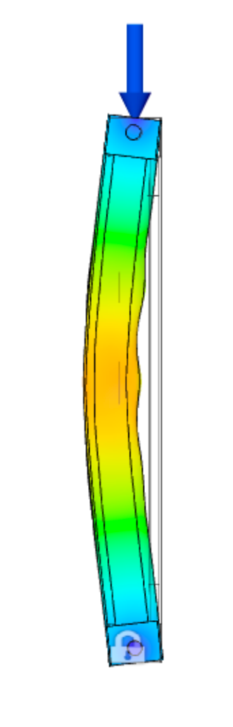 Performing basic buckling simulations in Autodesk Fusion 360 is fairly simple, and after some thought about the end conditions in the physical test setup, it was possible to establish similar conditions to the simulation. However, for future simulations it would be useful to establish end conditions using a specific ‘Pin’ feature which would truly treat the top and bottom connections as pinned rather than bonded. In addition, performing basic static tests on complex models is a recommended step in characterizing the behavior of a unique geometry. Complete this step particularly if the model configuration prevents easy intuition of the deformed shape.