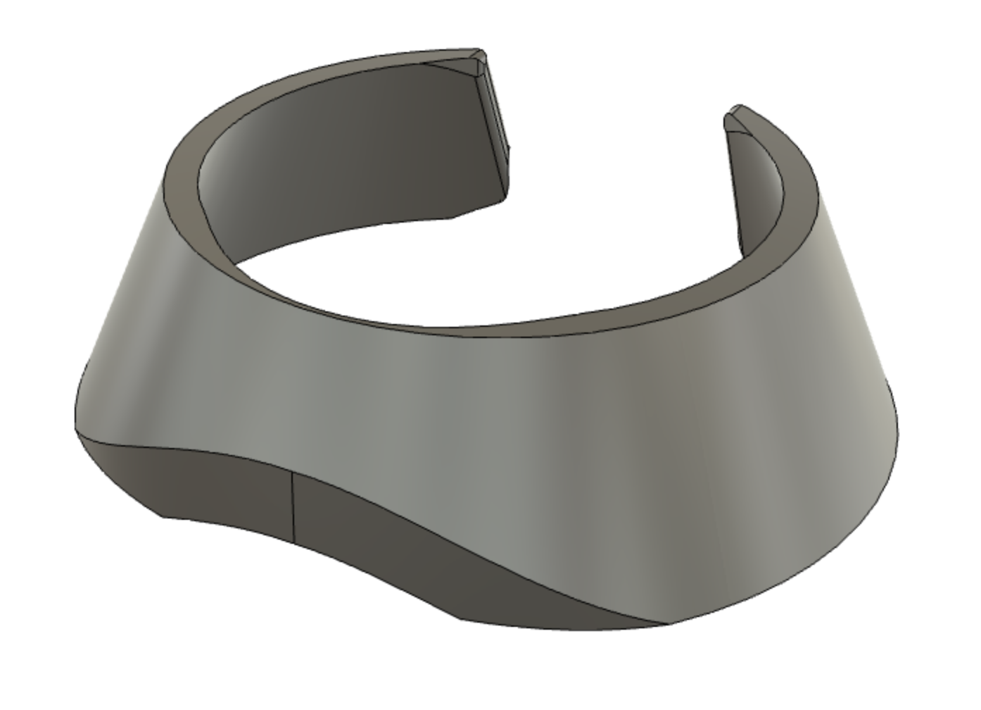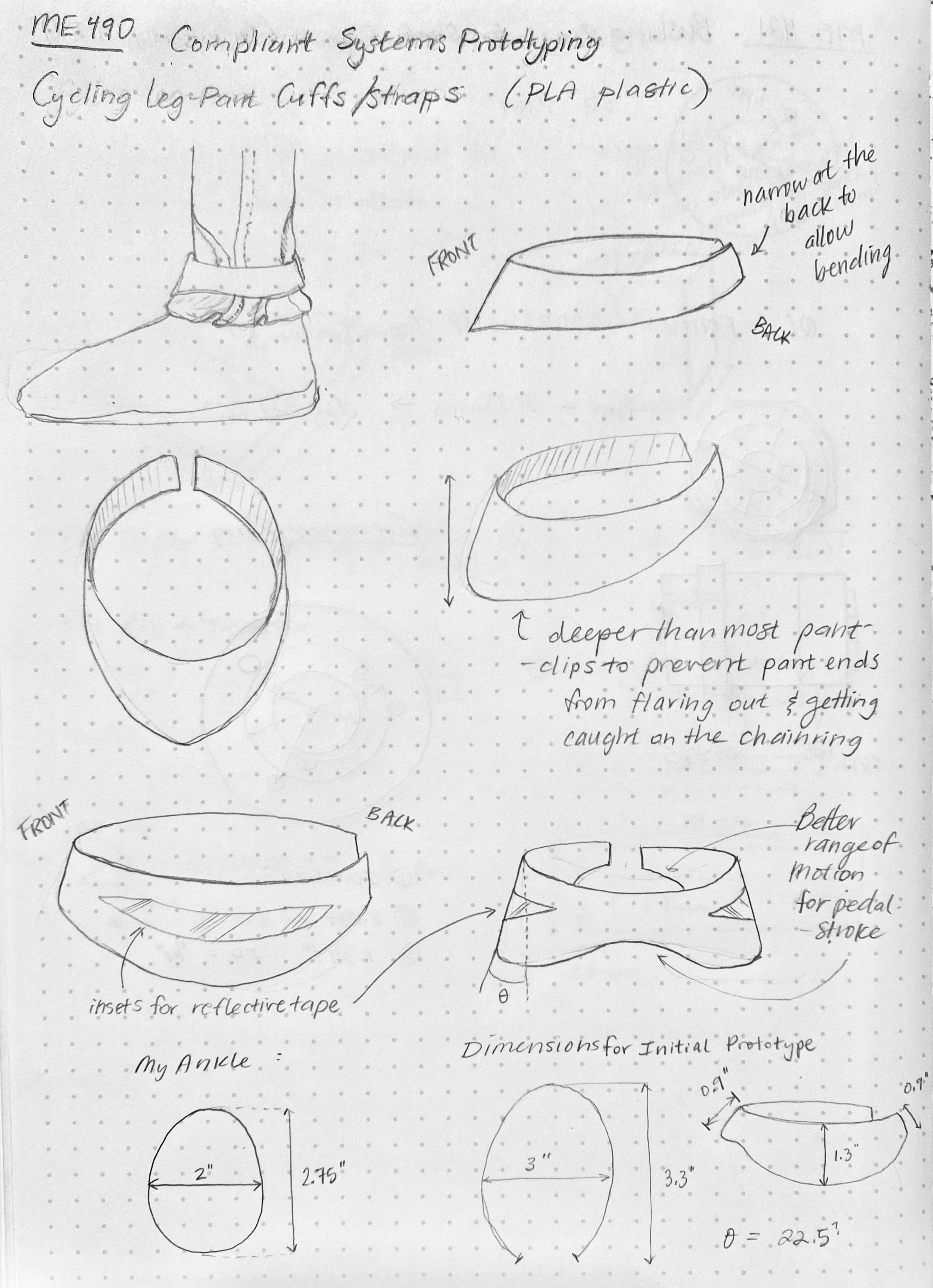 Below are my initial sketches. Note how the design evolves to allow unimpeded movement of the ankle and achilles during a complete pedal stroke. The outward flare is meant to capture the pant-leg hem which bunches and extends from beneath traditional bike straps. From here I decided to take an iterative approach and start my CAD model using dimensions based on my own ankle.