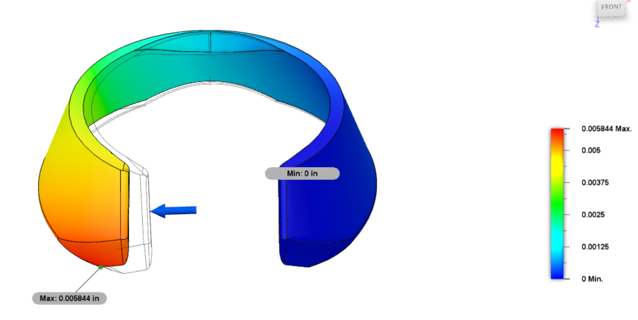 From here, it was necessary to perform FEA analysis on the exact geometry. Rough hand calculations may be possible, and could be accomplished by approximating the strap as a ring of constant thickness and radius. Next, using the known stiffness ratio based on the simplified ring’s geometry, deflections could be calculated given known forces. The open nature of the ring, however, would likely complicate this process as the deformation of an open ring may be highly non-linear.