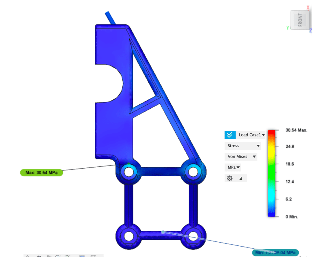 After some initial CAD work in Fusion 360, I ran some basic simulations to understand where the most vulnerable points of the component were (keeping in mind that the material properties of 3D printed metal differs significantly from that of solid stainless steel alloy.