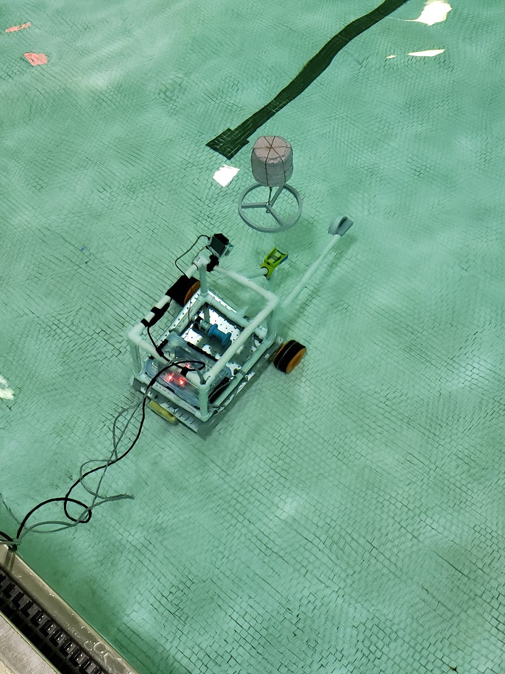 Once the identity of each object is determined, we can maneuver the robot so that the circular grey capture is underneath one of the treasure’s hooks. Releasing the spool allows the treasure to be caught and rise to the surface of the pool.