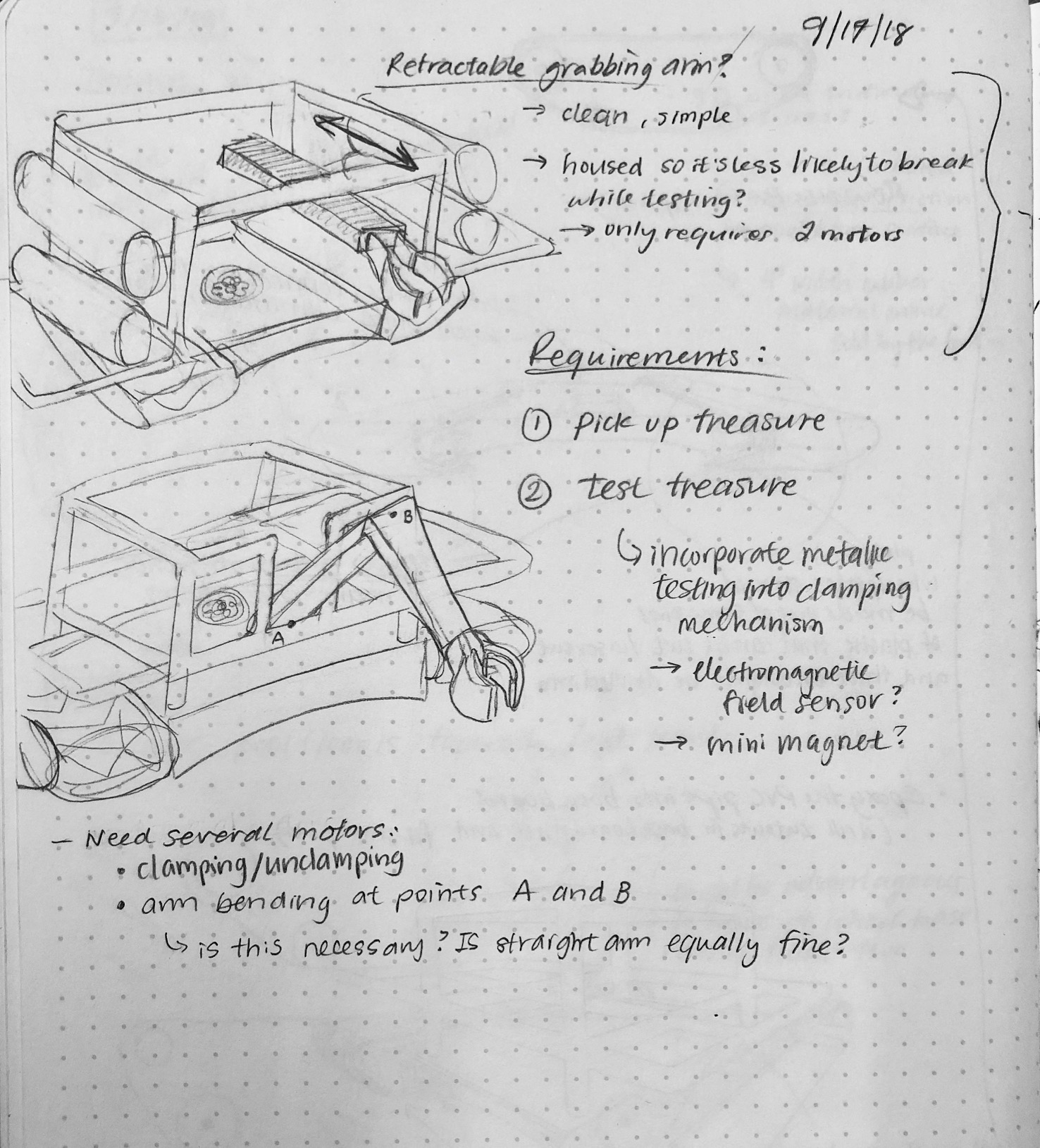 To detect the metal ‘treasure’, I had the idea of placing a strong magnet on a somewhat level surface which could be brought near each object to see whether not it is attracted. The magnet would either have no effect (near the plastic and aluminum objects) or stick to the object allowing the robot to maneuver without being attached to the magnet. The sensor arm is made up of a coil of wires, essentially a wide inductor. A small LED if the magnetic flux induced by the sensor is affected by the presence of either metal object.