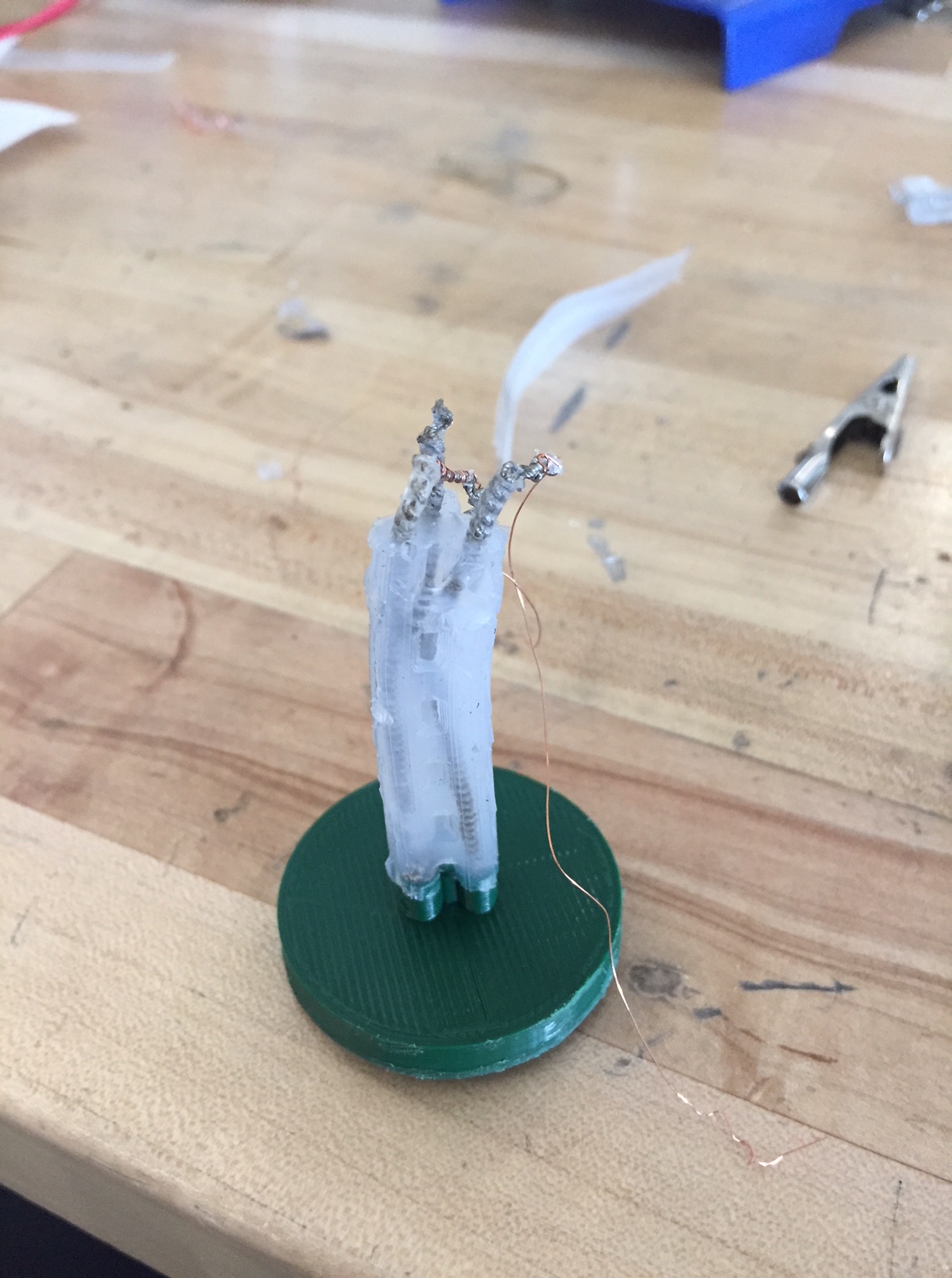 The mold was then filled with Smooth-On silicone and the initial prototype was casted, with three TCA nylon-copper actuators in the middle: