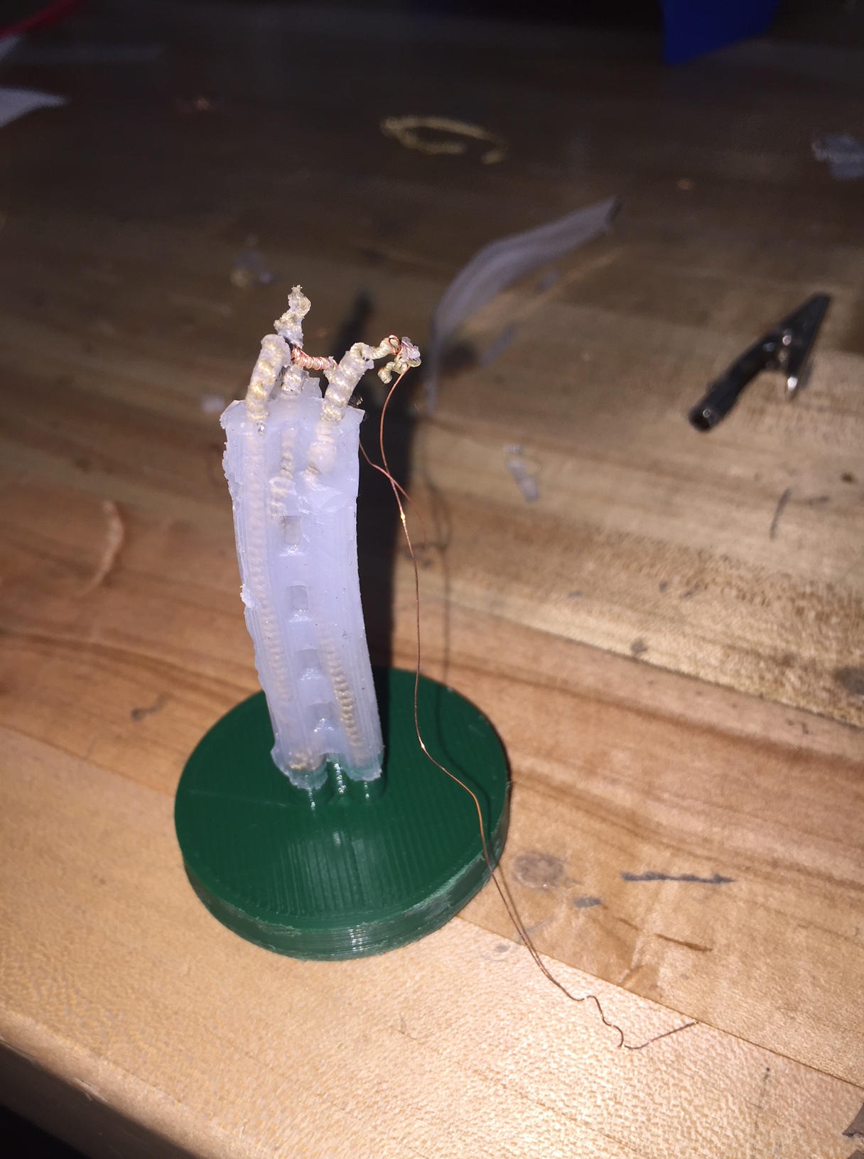 This solution worked relatively well, however a new problem became evident. The TCA’s are difficult to keep straight once threaded through the mold. When removed from the mold, they are often bent and therefore do not actuate well, if at all.